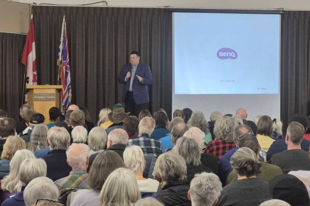 A crowd of close to 500 was lined up outside the doors early at Vernon’s Schubert Centre to hear the politicians’ message and to ask questions in the 90-minute evening meeting.